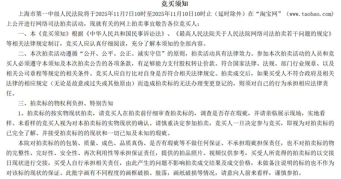 在上述拍品的競買須知中特別告知寫道,拍賣標的按實物現狀拍賣,請競買人在拍賣前仔細審查拍賣標的,調查是否存在瑕疵,并請親臨展示現場,實地看樣。該院對拍賣標的的包裝、質量、成色、品質真偽、是否有瑕疵等不作任何保證、不承擔瑕疵擔保責任,也不對拍賣標的物的完整性、完好性、安全性、再次利用性等承擔保證責任,提供的拍品照片、視頻僅供參考,買受人所競得的拍賣標的以交接日現狀進行交接,買受人自行承擔相關責任。