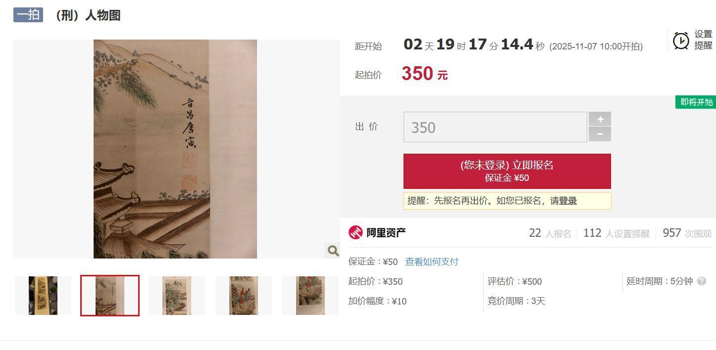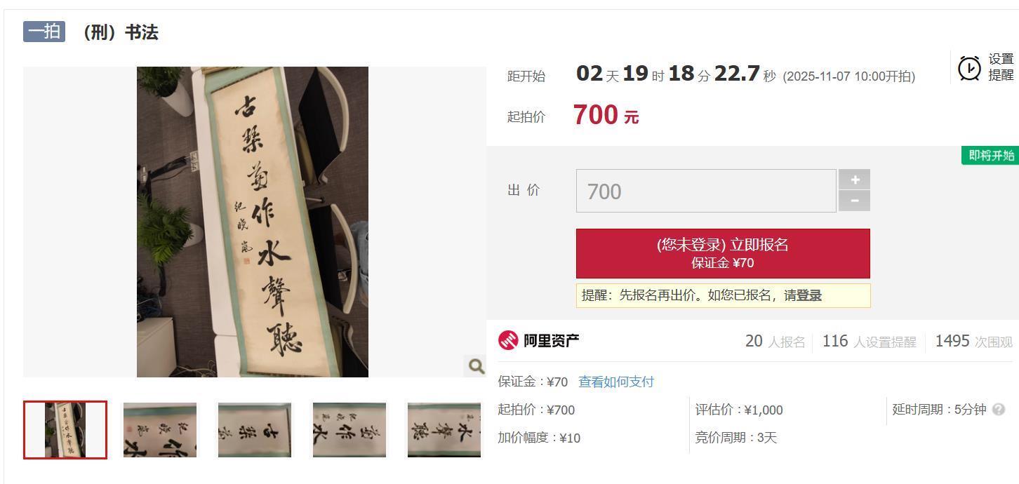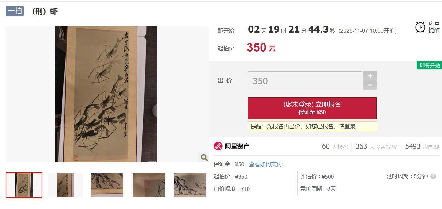 近期,涉及該案的一批字畫上架司法拍賣網站。截至11月4日,其中一幅落款為紀曉嵐的書法起拍價為700元,已有20人報名;一幅落款為唐寅的人物圖起拍價為350元,22人報名;一幅落款為齊白石的蝦圖,起拍價為350元,已有60人報名。上述幾件作品開拍時間為10月7日。