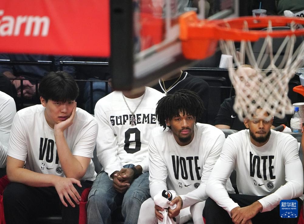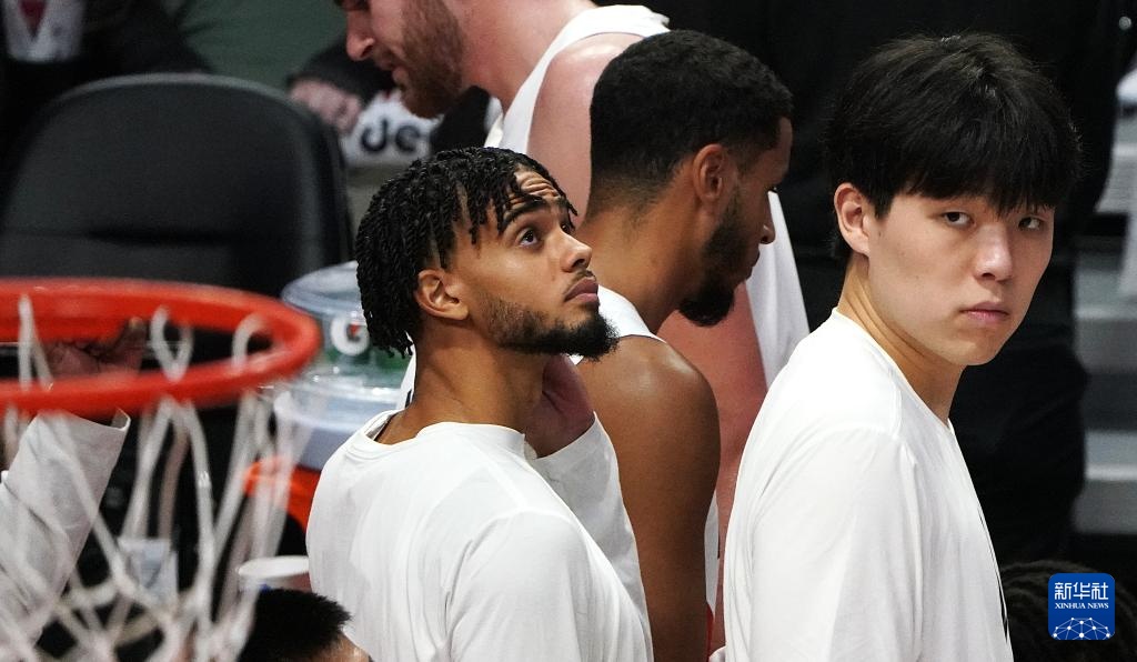 11月3日,楊瀚森(左一)坐在場(chǎng)邊替補(bǔ)席上觀戰(zhàn)。