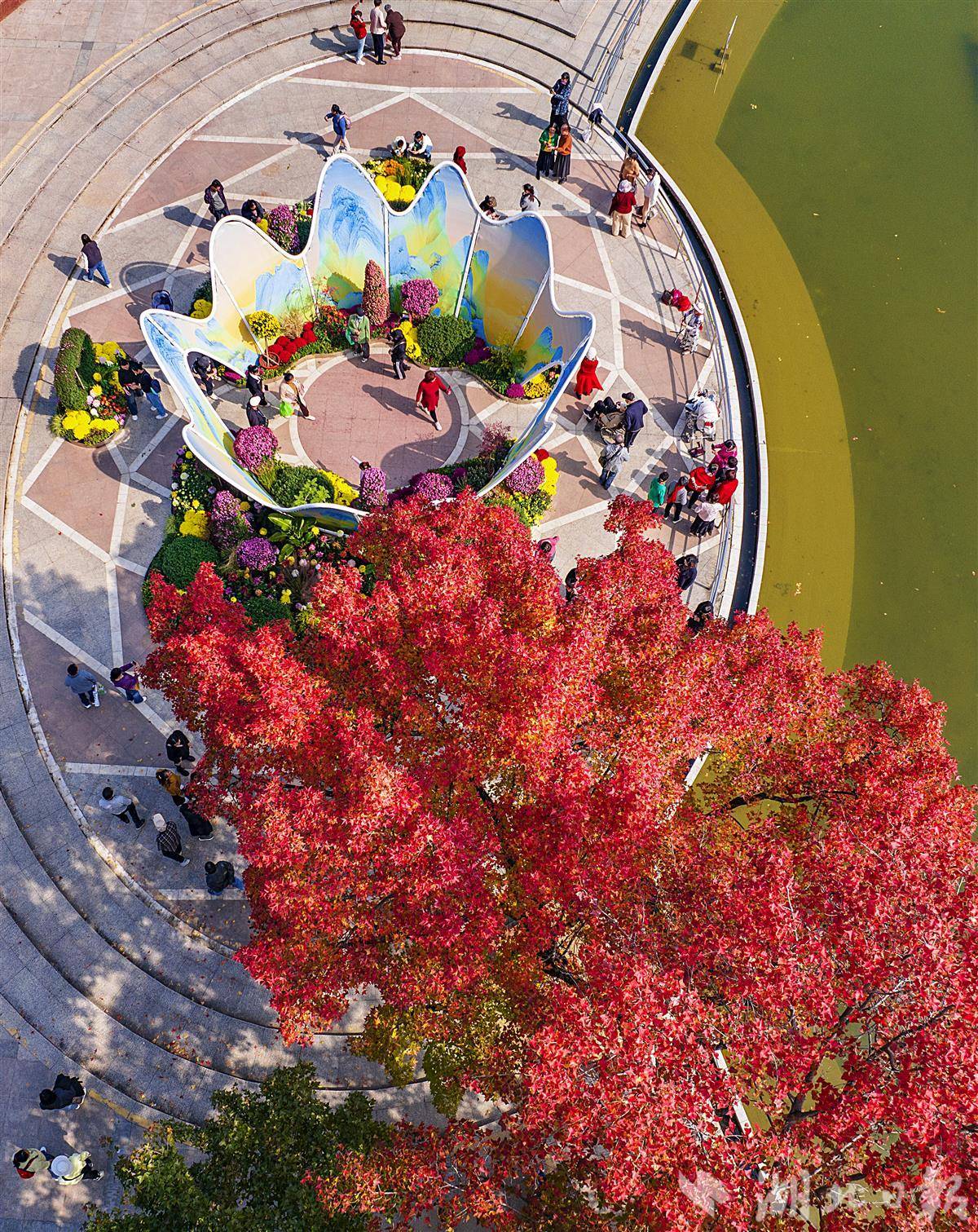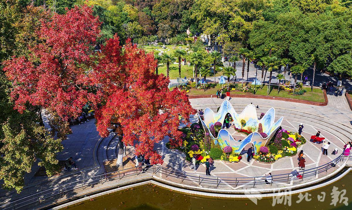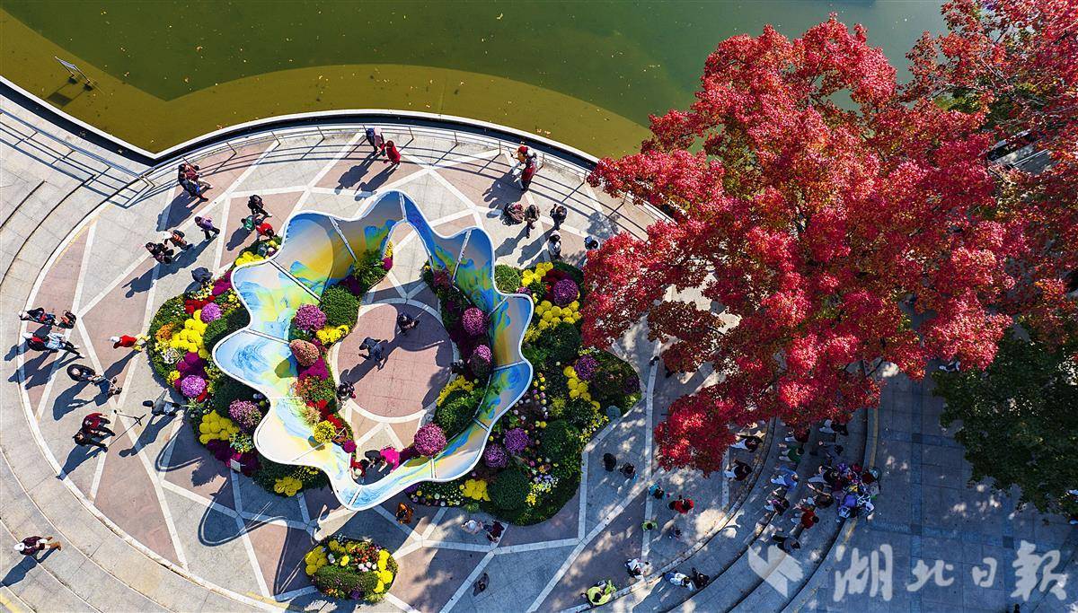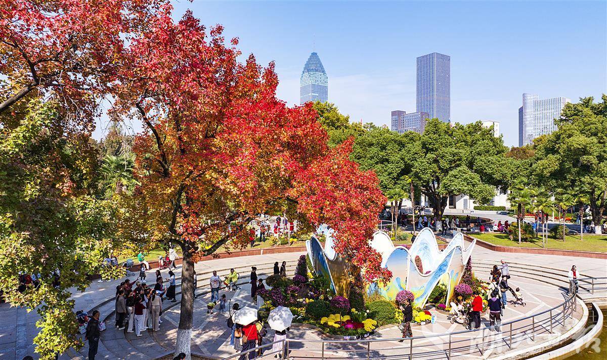 11月4日,武漢中山公園噴泉池旁邊的兩株楓樹(shù)已是一片火紅,樹(shù)下正舉行第42屆金秋菊展,許多游客和市民來(lái)到這里拍照游玩。有網(wǎng)友稱:中山公園不僅是武漢鬧市之中的“綠寶石”,而且也是武漢鬧市之中秋天的“調(diào)色板”,楓葉紅了,武漢的秋天就來(lái)了。(湖北日?qǐng)?bào)全媒記者 朱熙勇 攝)
