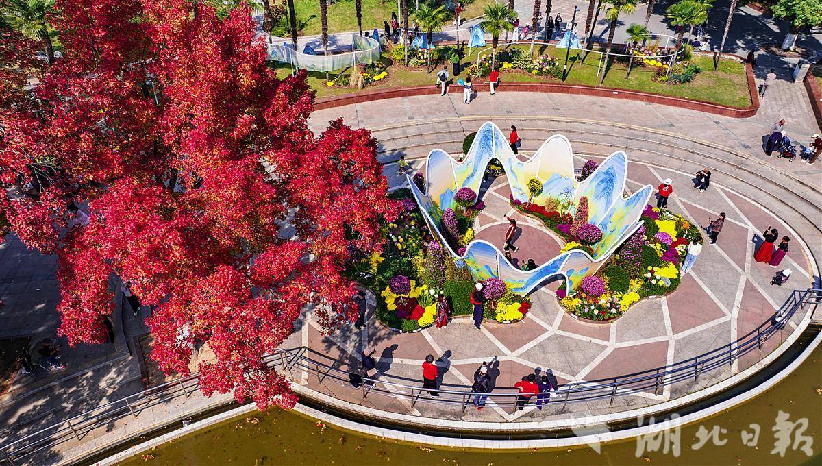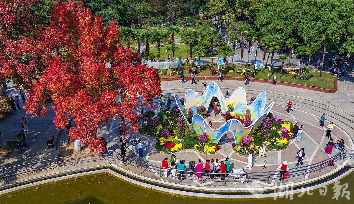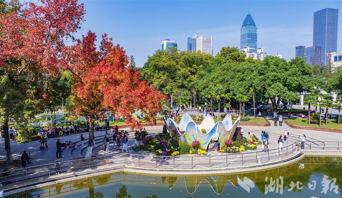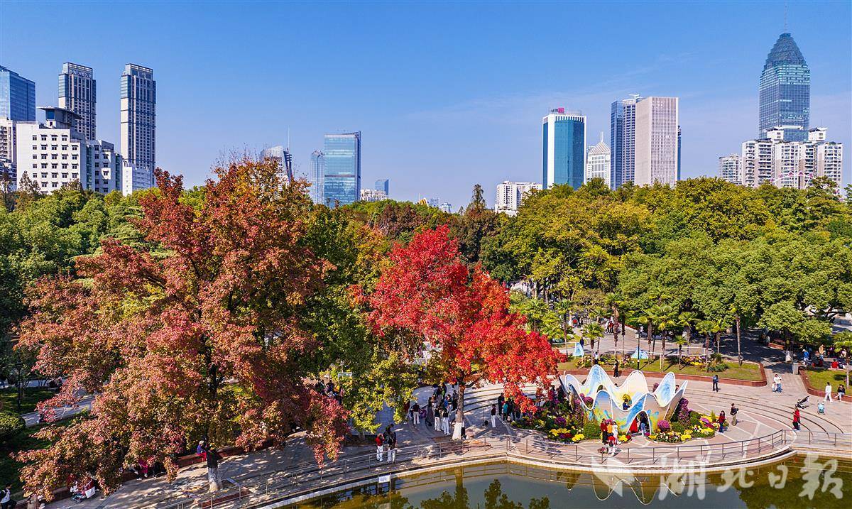 11月4日,武漢中山公園噴泉池旁邊的兩株楓樹(shù)已是一片火紅,樹(shù)下正舉行第42屆金秋菊展,許多游客和市民來(lái)到這里拍照游玩。有網(wǎng)友稱:中山公園不僅是武漢鬧市之中的“綠寶石”,而且也是武漢鬧市之中秋天的“調(diào)色板”,楓葉紅了,武漢的秋天就來(lái)了。(湖北日?qǐng)?bào)全媒記者 朱熙勇 攝)