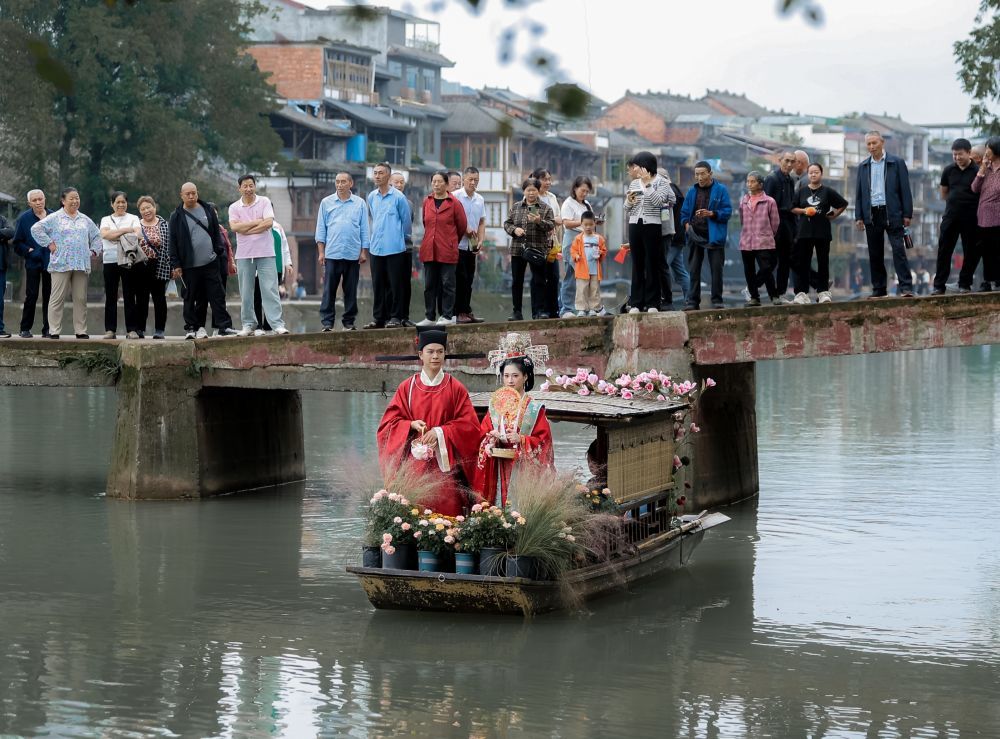 國慶節期間,成都邛崍市夾關古鎮舉行的水上婚禮儀式。(受訪單位供圖)