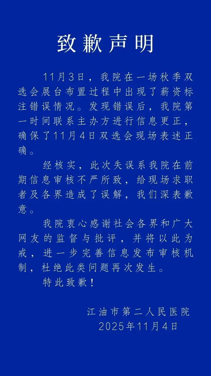 11月4日,江油市第二人民醫院發布致歉聲明:11月3日,醫院在一場秋季雙選會展臺布置過程中出現了薪資標注錯誤情況。發現錯誤后,醫院第一時間聯系主辦方進行信息更正,確保了11月4日雙選會現場表述正確。