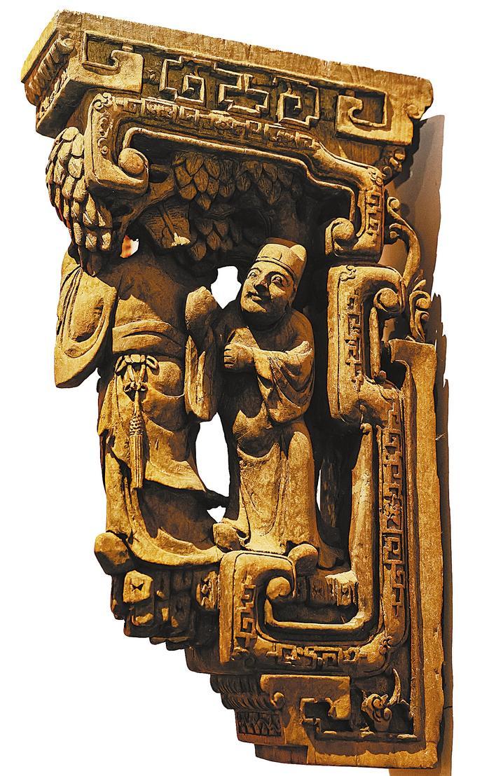 走進展廳,“牢而不固”的各式榫卯、“墻倒屋不塌”的抬梁式與穿斗式框架、梁柱間兼具結構承重與裝飾功能的層疊斗拱、穹頂上繁花似錦的藻井等,精妙地展現出高超的古建營造技藝。展覽展出的一組源于民間收藏愛好者的老物件格外引人注意,獅座、牛腿、騎馬雀替、綽幕等木構件雕飾精美、題材多樣,展示著古建獨特的藝術和審美意趣。