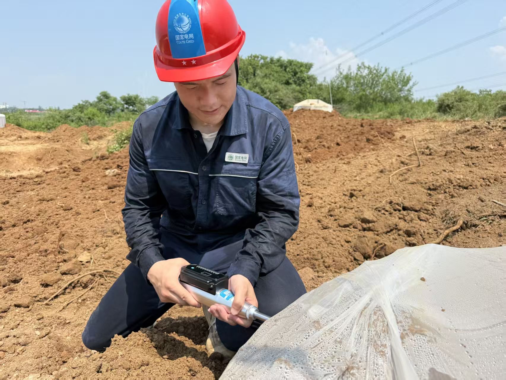 項目部技術員劉偉康在施工現場對基礎進行檢測。通訊員供圖