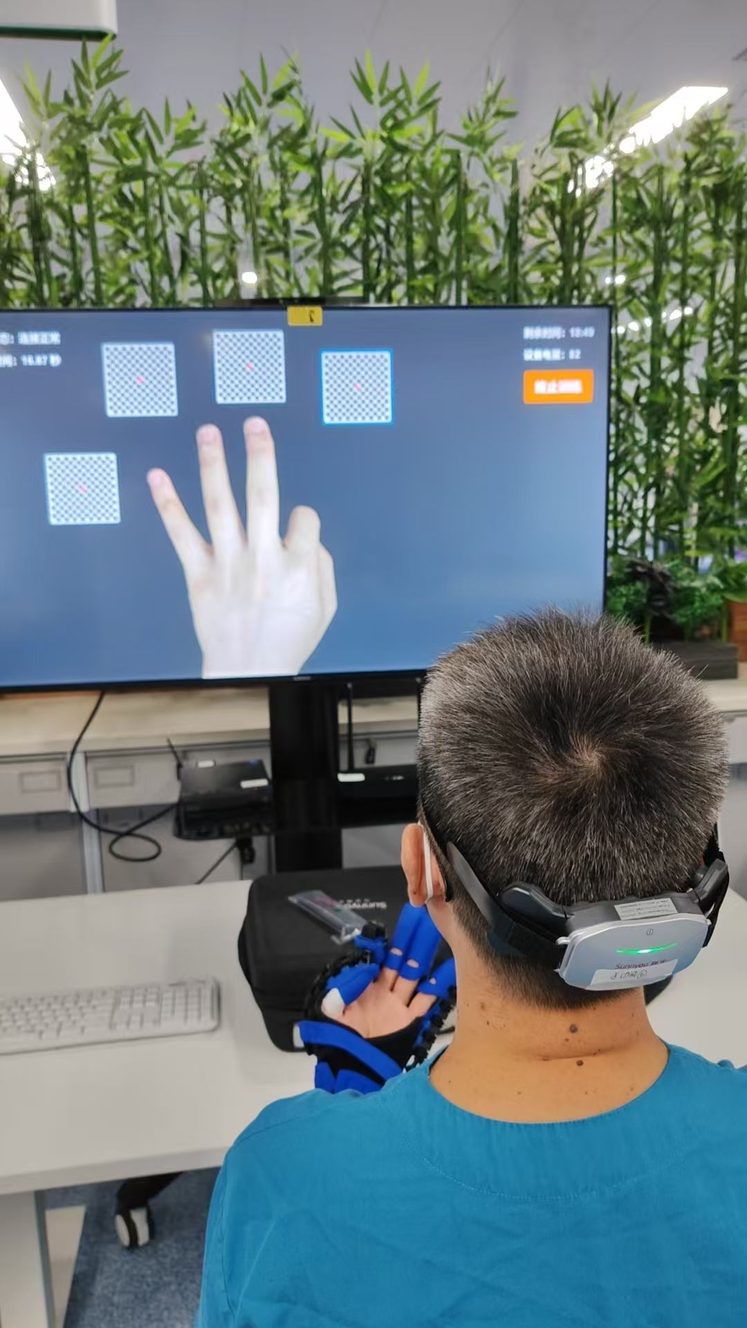 儀式結束后,與會人員移步至醫院康復治療中心的腦機接口作業治療區,一位男性患者頭戴輕便的無創腦電帽,腦機交互手功能康復機器人精準捕捉著他每一絲神經信號。他凝神注視屏幕上的虛擬手——幾秒后,機械手套應聲而動,而他的手指也隨之抓握起來。