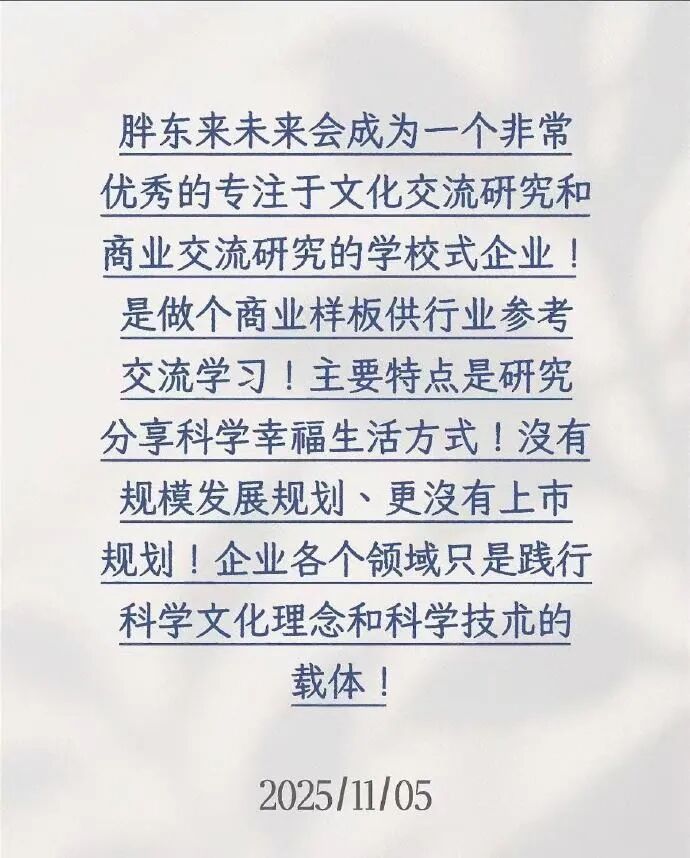 11月5日,胖東來(lái)創(chuàng)始人于東來(lái)在社交平臺(tái)發(fā)文:胖東來(lái)未來(lái)會(huì)成為一個(gè)非常優(yōu)秀的專(zhuān)注于文化交流研究和商業(yè)交流研究的學(xué)校式企業(yè)。沒(méi)有規(guī)模發(fā)展規(guī)劃、更沒(méi)有上市規(guī)劃。