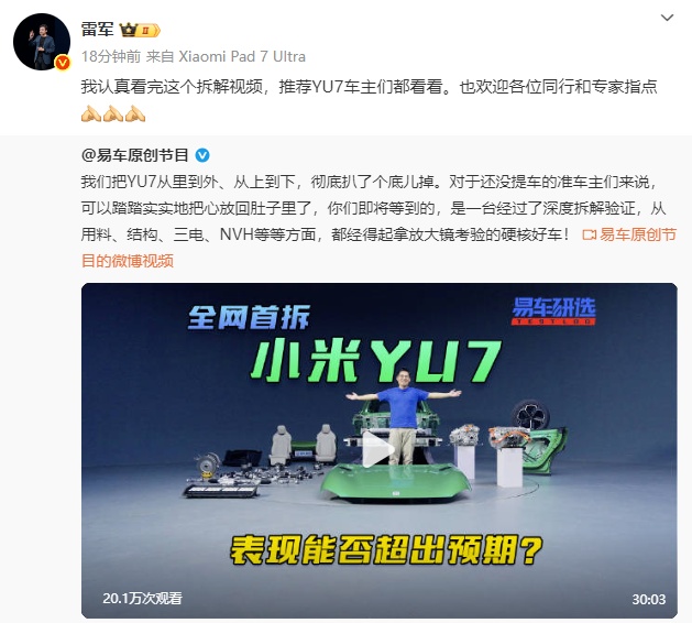 對(duì)此,雷軍回應(yīng)稱,我認(rèn)真看完這個(gè)拆解視頻,推薦YU7車(chē)主們都看看。也歡迎各位同行和專(zhuān)家指點(diǎn)。