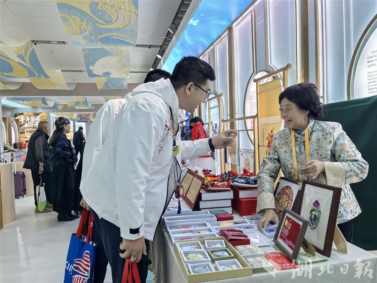 “紅安繡活”非遺技藝傳承人劉壽仙正在向觀眾介紹產(chǎn)品。(記者王艷華攝)