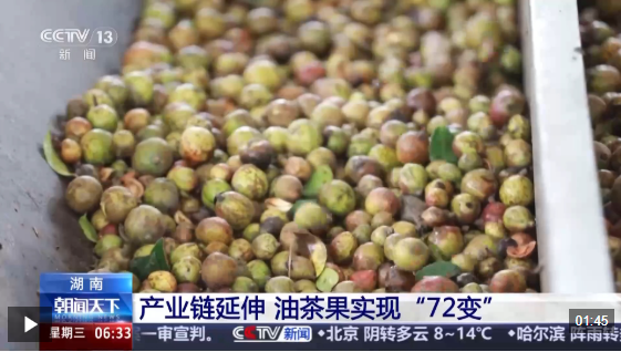 攸縣林業局局長 唐江南:我們通過油茶龍頭企業的帶動,把一顆油茶果基本上做到了吃干榨凈。從油茶的產品來說,除了茶油主打產品還產生了茶麩粉,清潔洗滌用品,還有茶麩洗發粉、茶油精油、護膚品、洗發水等一系列的衍生產品。