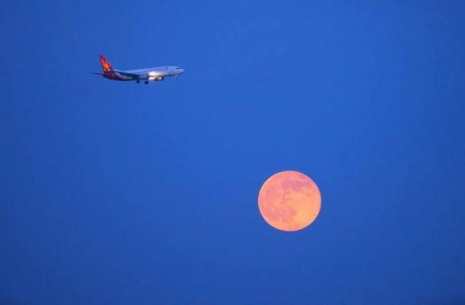 2025年10月11日,浙江省溫州市,飛機與滿月同框。新華社圖片