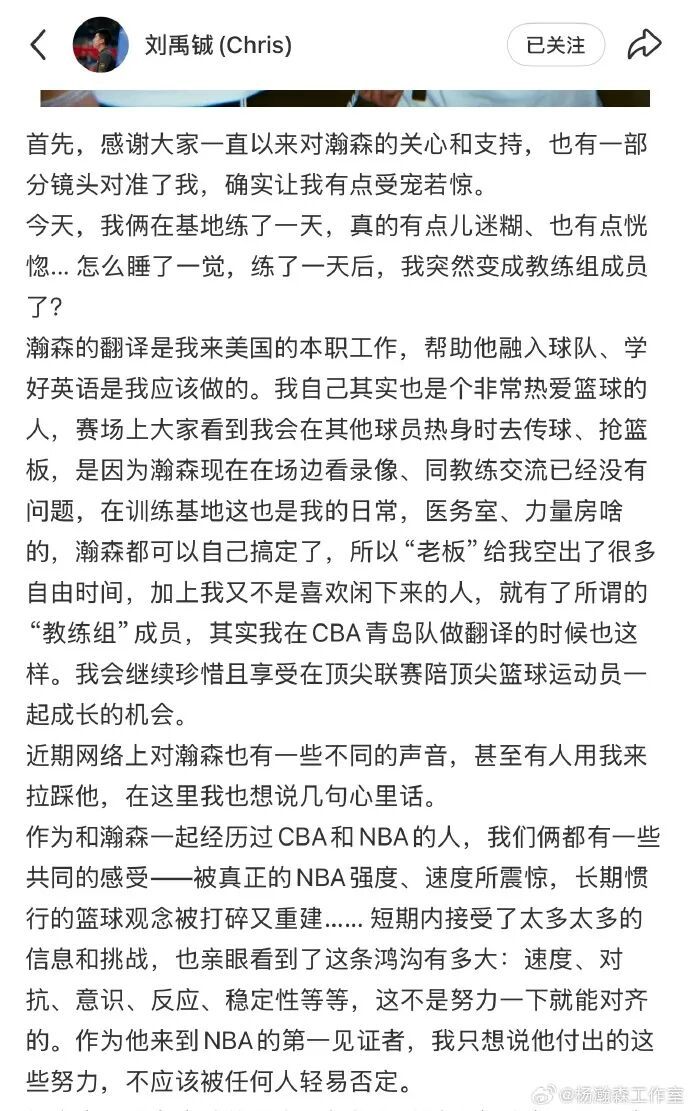 據(jù)此前報(bào)道,近日,有關(guān)NBA波特蘭開拓者隊(duì)球員楊瀚森的翻譯“加入球隊(duì)教練組”的傳聞引發(fā)關(guān)注。對(duì)此,楊瀚森的隨行翻譯劉禹鋮在個(gè)人社交媒體上發(fā)文澄清,表示自己的主要工作仍是協(xié)助楊瀚森在美國的生活與訓(xùn)練,幫助他更好地適應(yīng)球隊(duì)環(huán)境、提高英語能力。