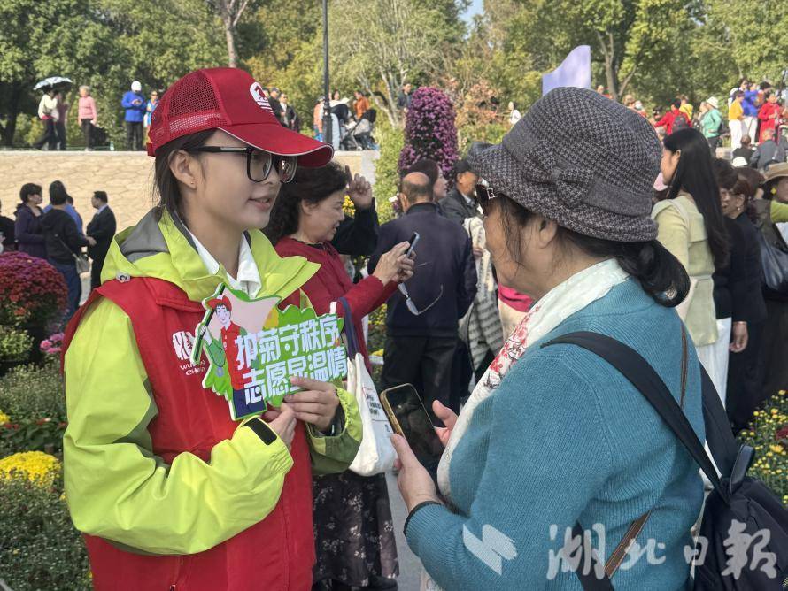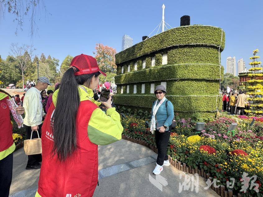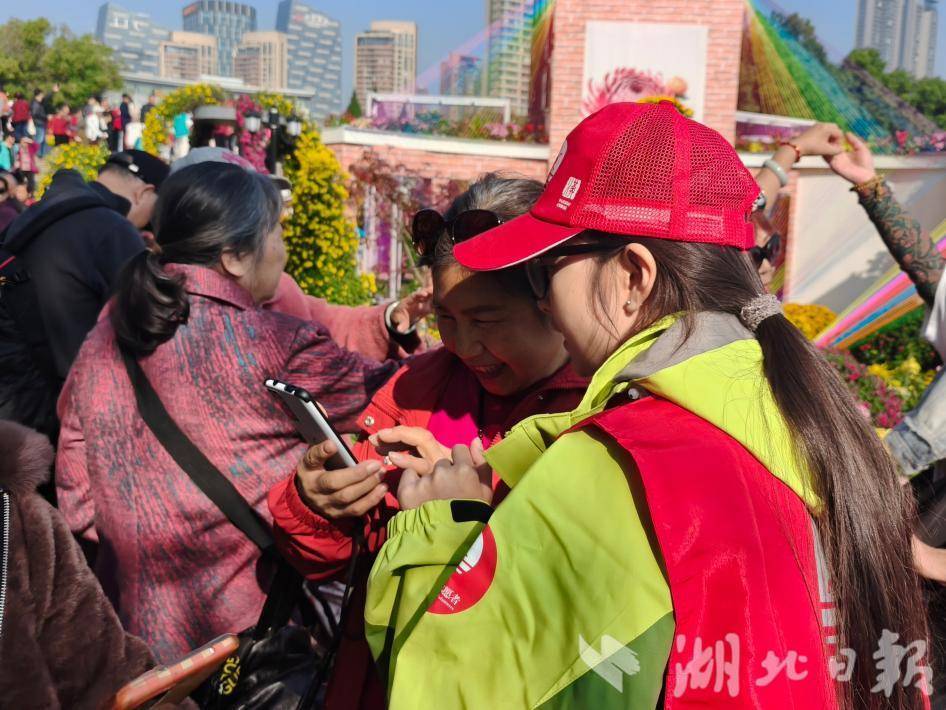 “為了這次服務,我們提前做了功課,不僅背熟了展區路線,還專門學習了武漢地標歷史和菊花品種知識。”志愿者葉畢云是專業導游,她正對著一群來自隨州的旅游團講解巴公房子的百年變遷:“這棟老建筑見證了漢口開埠后的繁華,如今復刻在菊展中,就是想讓大家在賞菊時也能觸摸到武漢的歷史脈絡。”游客們聽得津津有味,不時點頭提問,并拉著葉畢云合影留念。