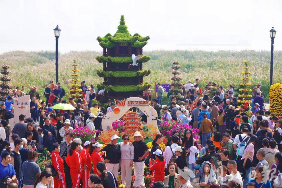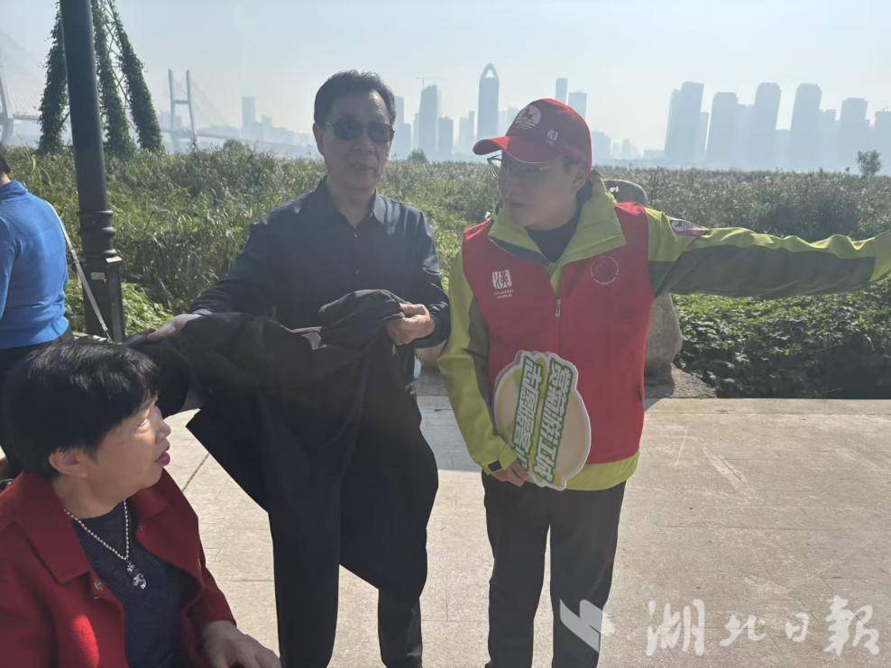 來自上海的游客陳女士帶著父母賞菊,剛到江灘就遇到了志愿者指引:“我們是第一次來武漢,本來擔心找不到位置,沒想到志愿者體貼地為我們提供服務,還詳細告訴我們武漢最佳游覽路線。”她的母親笑著補充:“剛才想拍張和黃鶴樓復刻景的合影,志愿者主動幫我們調整站位,還提醒我們注意腳下的花苗,特別貼心。”