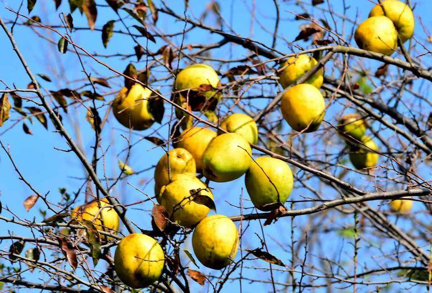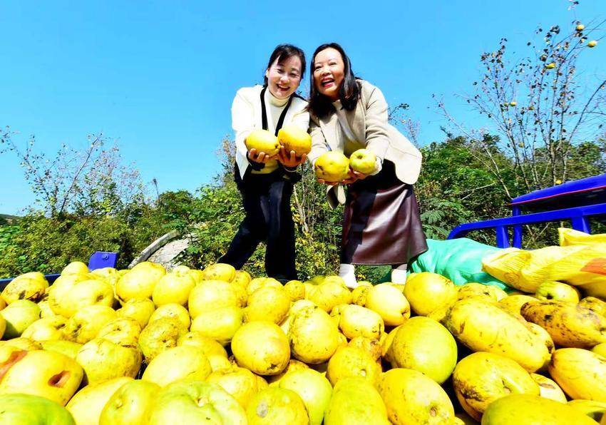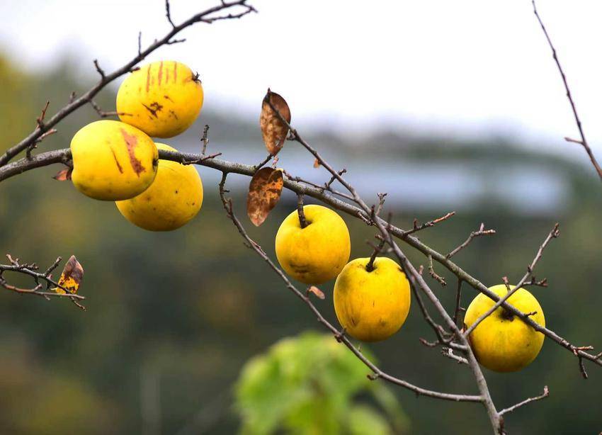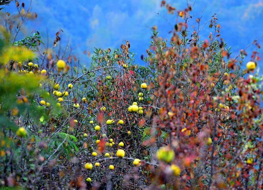時值秋深,山色依舊蒼翠,而那層層疊疊的梯田上,木瓜閃亮登場了。它們不像花那般招搖,卻自有一種沉甸甸的、果實獨有的風華。有的金黃,像凝固的陽光;有的青中透黃,似未磨的翡翠,暈著柔和的光。一嘟嚕一嘟嚕地,壓彎了遒勁的枝,仿佛整個秋天所有的豐腴與甜蜜,都凝結在這片園子里。