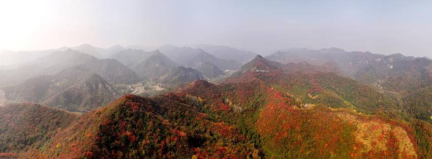 當日早晨,登上山頂放眼望去,秋色如同濃墨重彩的畫筆,將連綿的山巒渲染得五彩斑斕,每一片紅葉都在陽光下競相綻放其最熱烈的色彩。