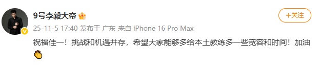 前國腳李毅發(fā)文:祝福佳一!挑戰(zhàn)和機(jī)遇并存,希望大家能夠多給本土教練多一些寬容和時間!加油。
