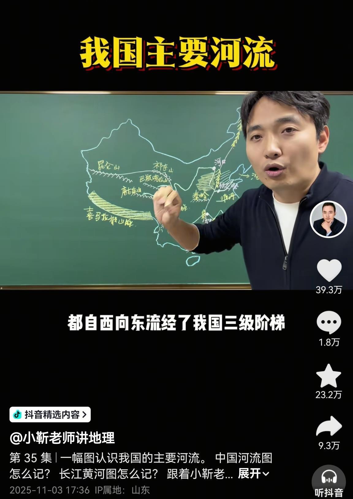 “一幅圖帶大家認識我國的主要河流!”11月3日,抖音博主“小靳老師講地理”一條講述我國主要河流的視頻漲粉10.4萬,加上其他幾條系列視頻,漲粉超20萬,有網友稱其為“手繪地圖打印機”。11月5日,小靳老師回應極目新聞記者,近20年來他深耕地理專業,很欣慰能夠將精彩的課堂不斷地分享出去,讓更多的人受益。