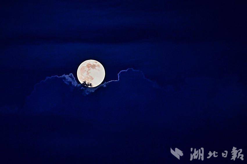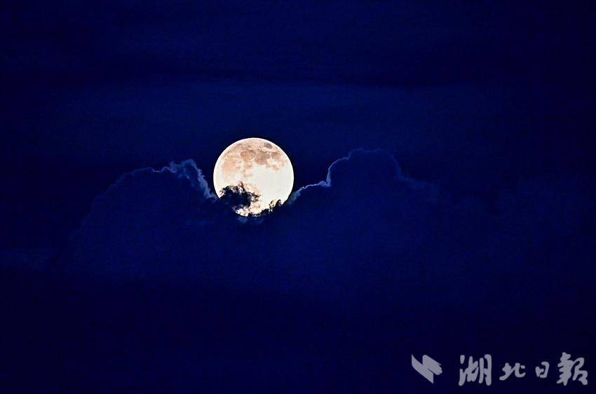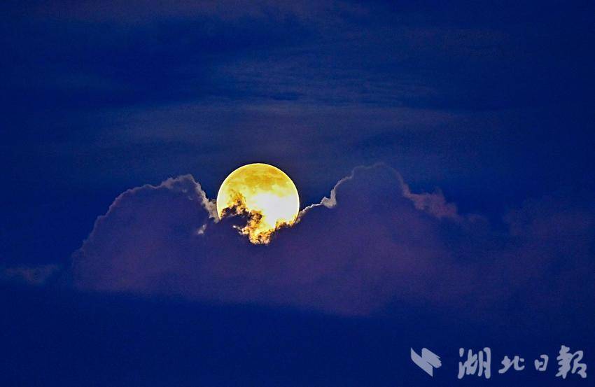 11月5日17時50分,武漢東湖上空的超級月亮,好像巨大的蛋一樣從云中“破殼”而出,太美了!但這是曇花一現,10分鐘后被云層蓋著了。(湖北日報全媒記者 朱熙勇 攝)