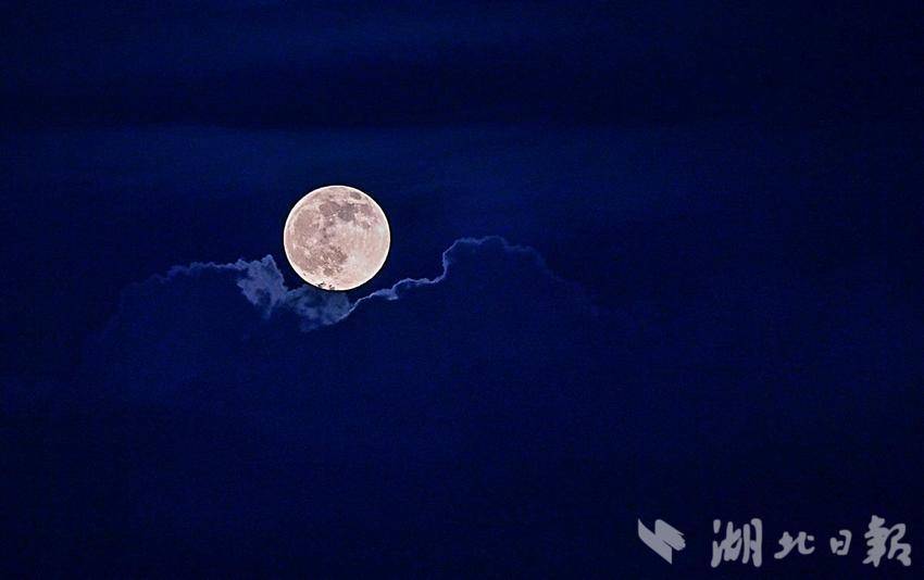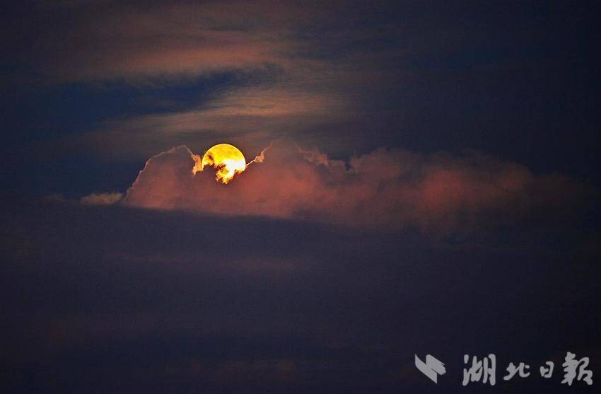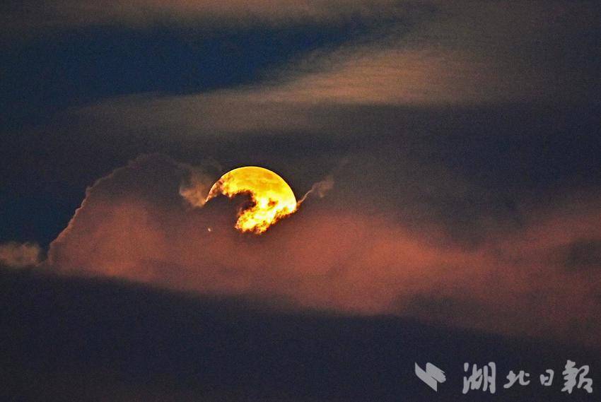 11月5日17時50分,武漢東湖上空的超級月亮,好像巨大的蛋一樣出云中“破殼”在而出。