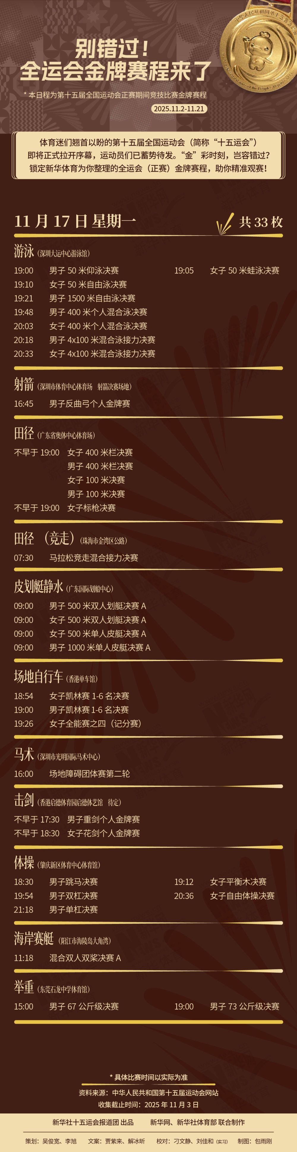 體育迷們翹首以盼的第十五屆全國(guó)運(yùn)動(dòng)會(huì)(簡(jiǎn)稱(chēng)“十五運(yùn)會(huì)”)即將正式拉開(kāi)序幕,運(yùn)動(dòng)員們已蓄勢(shì)待發(fā)。“金”彩時(shí)刻,豈容錯(cuò)過(guò)?鎖定新華體育為你整理的全運(yùn)會(huì)(正賽)金牌賽程,助你精準(zhǔn)觀賽!