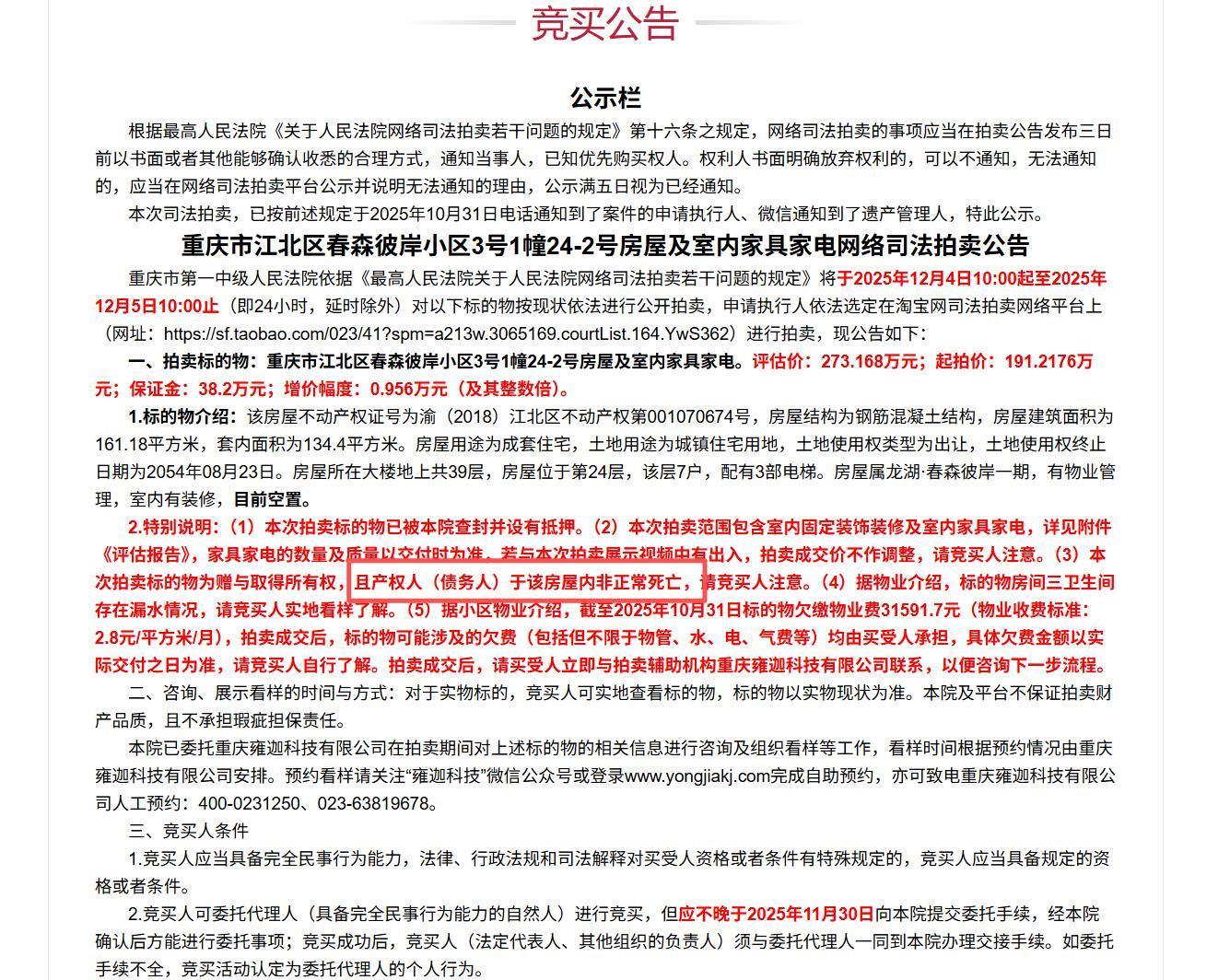 11月3日,重慶市第一中級人民法院發布了一則司法拍賣公告,位于重慶市江北區春森彼岸小區一套134平方米的房屋被司法拍賣,起拍價191萬元。值得注意的是,公告里特別提示,產權人(債務人)在該房屋內非正常死亡。