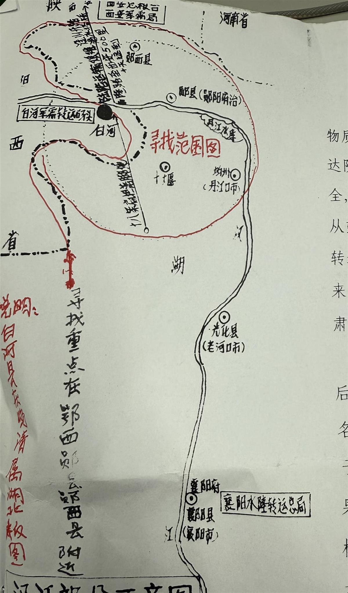鄭用威的女兒鄭麗萍告訴記者,在極目新聞發(fā)出報道后,父親很開心,希望可以借助媒體的力量,早日找到“十八條扁擔”后人。根據(jù)最近老人手繪的一張尋找范圍圖上,可以看到老人標注的疑似范圍在今陜西省安康市白河縣、湖北省十堰市、鄖西縣、丹江口市及周邊。