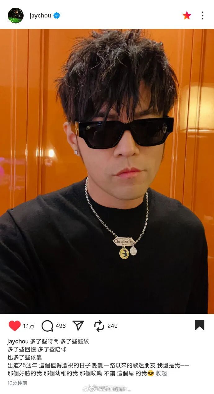 11月6日,周杰倫出道25周年發文:“多了些時間,多了些皺紋,多了些回憶,多了些陪伴,也多了些依靠。出道25周年,這個值得慶祝的日子,謝謝一路以來的歌迷朋友。“他表示,他還是從前那個他,沒有改變。
