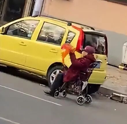 視頻顯示,一位頭發花白的老太穿著紅色棉襖,處于馬路中央的雙實線附近,時而坐在輪椅上,時而又能站立起來,手中揮舞著一塊手帕,在道路中間旋轉、跳舞,致使路過車輛被迫紛紛減速、緊急避讓,多輛小車被逼停。