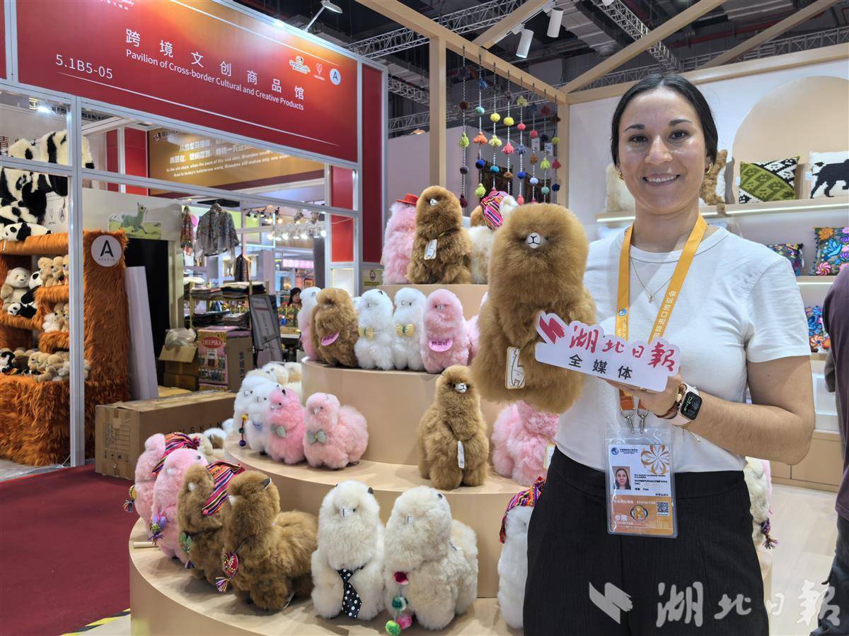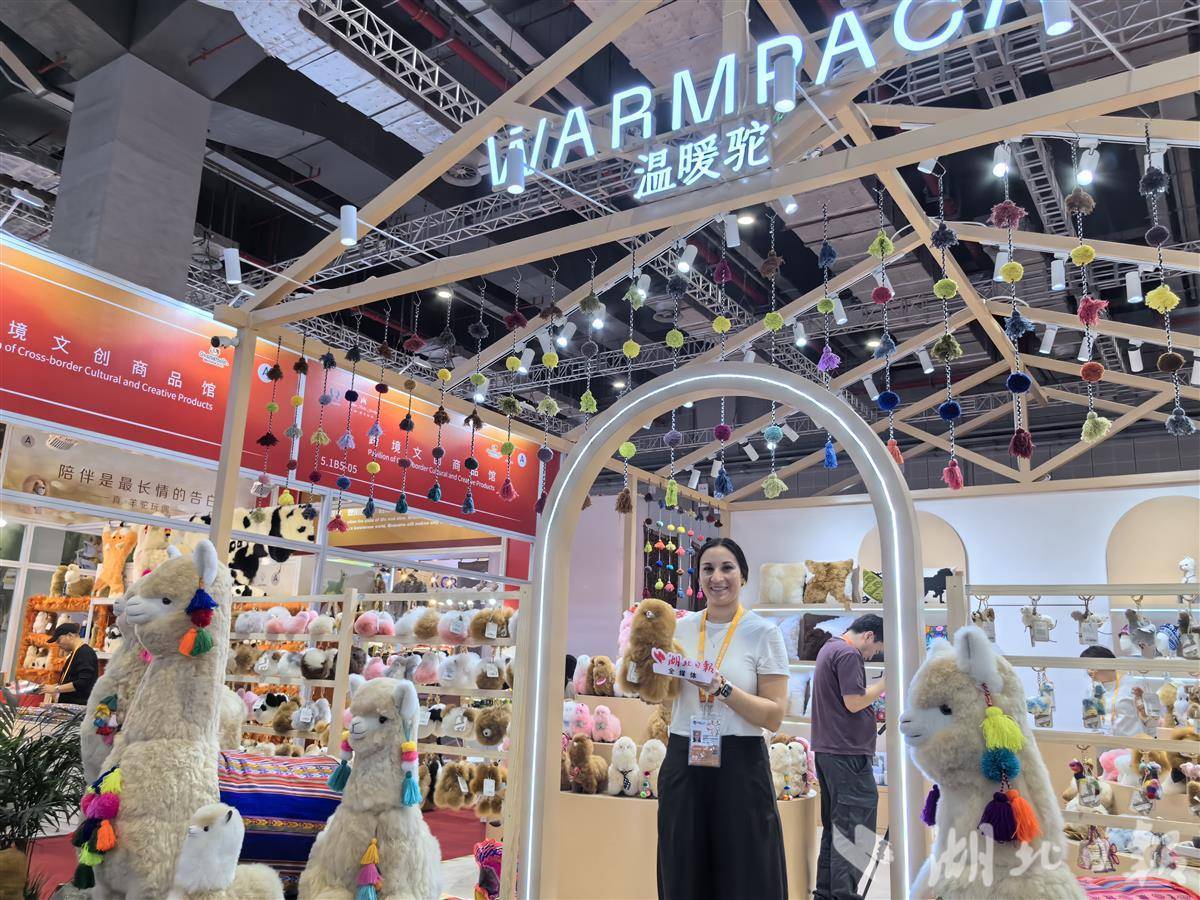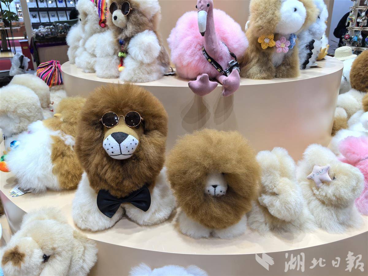 在“四葉草”5.1館消費品展區,“溫暖駝(WARMPACA)”展臺好似“羊駝派對”——木屋形狀的吊頂上,掛著一串串南美風情的吊墜,毛茸茸的羊駝玩偶有的一人高、有的手掌大小,它們耳朵、脖子上系著五彩墜飾,讓路過的國內外客商忍不住掏出手機拍照。
