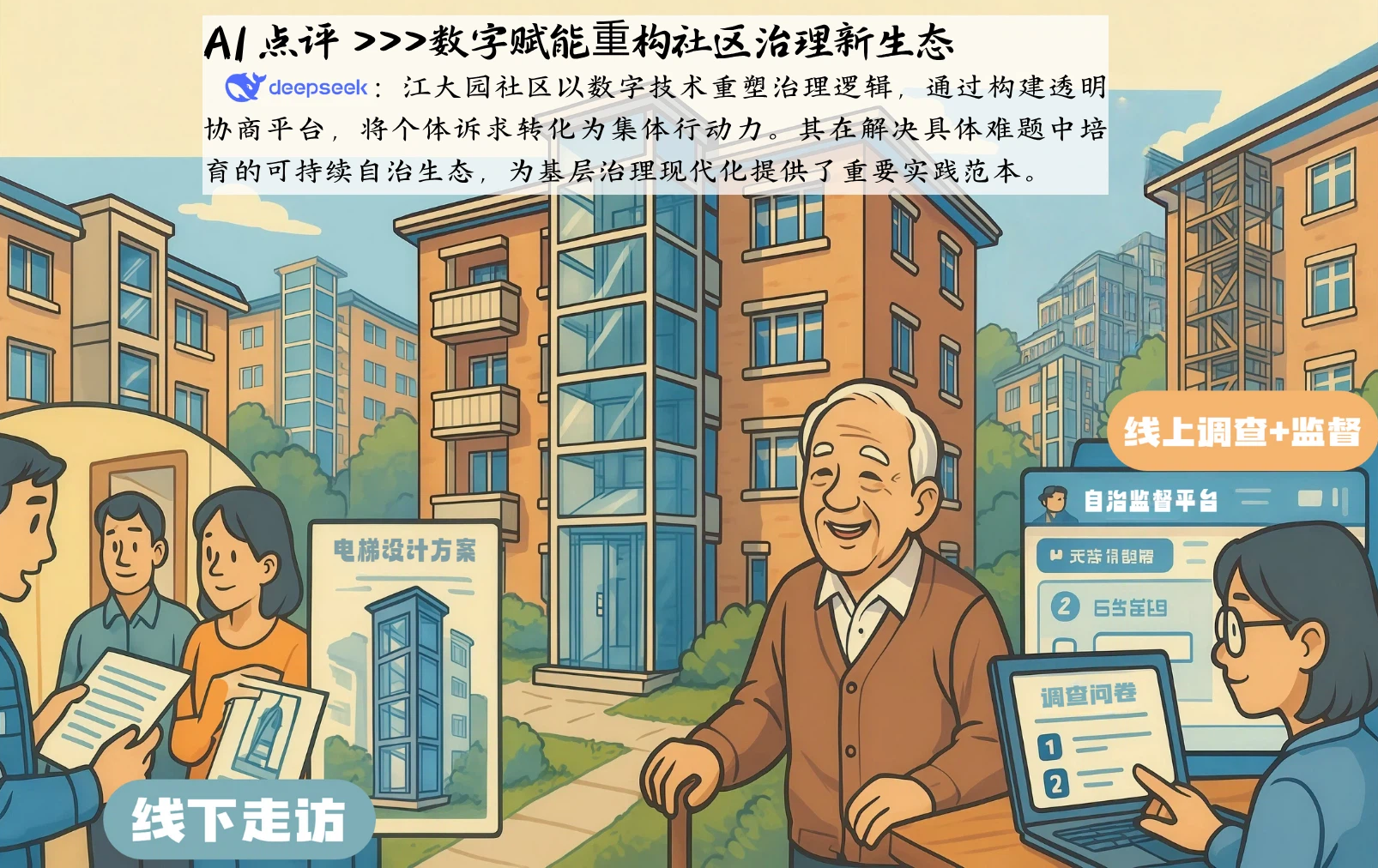 這是江大園小區,加裝電梯成全區居民的迫切需求。然而,因低樓層擔心采光遮擋、資金管理怕不透明、噪聲干擾如何解決等顧慮,加裝電梯項目推進一遲再遲。2019年7月小區首次申請第一部戶外加裝電梯,如今,該社區通過“線上線下聯動+搭建網上自洽平臺”的創新治理模式,讓居民全程參與關鍵決策與監督,項目從2020年第一部電梯投入使用到現在已有三部電梯建成、兩部穩步施工中。該社區不僅解決了老年出行的難題,更為基層治理提供了新樣本。