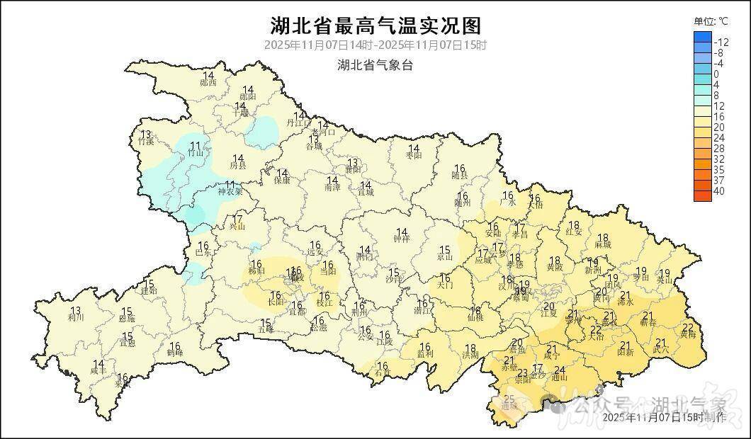 5日起,全省普降小到中雨。7日白天,雨水覆蓋范圍縮減,鄂東南地區氣溫回升,15時鄂東南氣溫20至24℃,局地達25℃,其他大部地區14至19℃。
