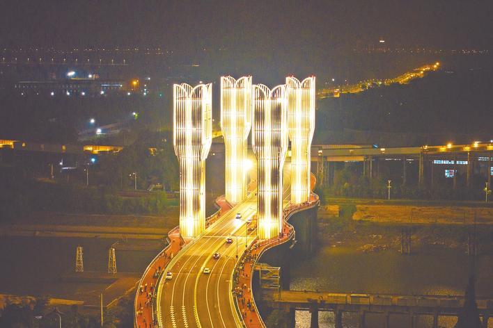 11月8日晚,位于青山區的武漢首座升降橋——右岸大道開啟橋燈火輝煌,4根橋梁升降立柱在夜幕中十分耀眼,吸引不少市民前來打卡拍照。