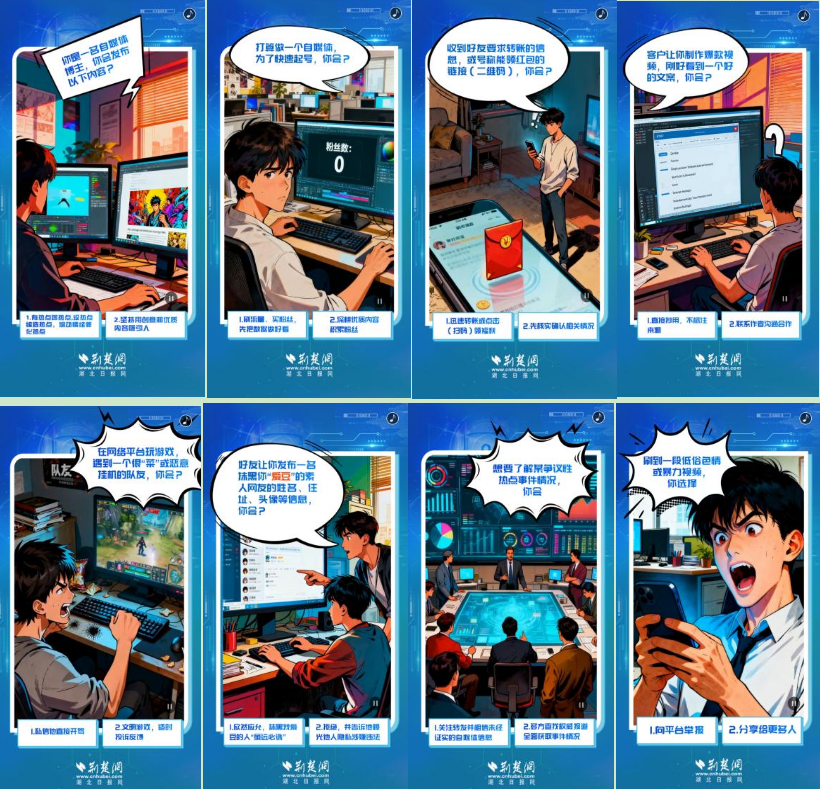為讓網(wǎng)絡(luò)文明理念更具感染力,活動(dòng)精心策劃了宣傳視頻與漫畫組圖,以故事化表達(dá)和場景化呈現(xiàn)傳遞網(wǎng)絡(luò)文明內(nèi)核。宣傳視頻用顏色描繪湖北網(wǎng)絡(luò)文明的實(shí)踐成果(跟著視頻解鎖多彩的湖北網(wǎng)絡(luò)文明),引發(fā)網(wǎng)民廣泛共鳴。漫畫組圖則將2025年湖北省網(wǎng)絡(luò)文明宣傳月宣傳推廣語(漫畫組圖帶你讀懂如何助力網(wǎng)絡(luò)文明),轉(zhuǎn)化為通俗易懂的畫面,搭配簡潔有力的文字說明,讓文明用網(wǎng)的理念看得見、記得住。