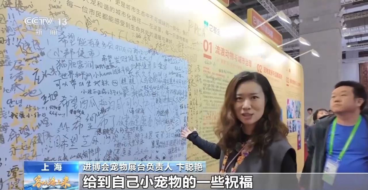 進博會寵物展臺負責人 卞聰艷:當時我們想留一面墻?,F在養寵物的人比較多,希望大家可以對自己的寵物寫一些祝福的話。開展第二天我發現這邊寫得密密麻麻的,都是這些鏟屎官給到自己小寵物的一些祝福。