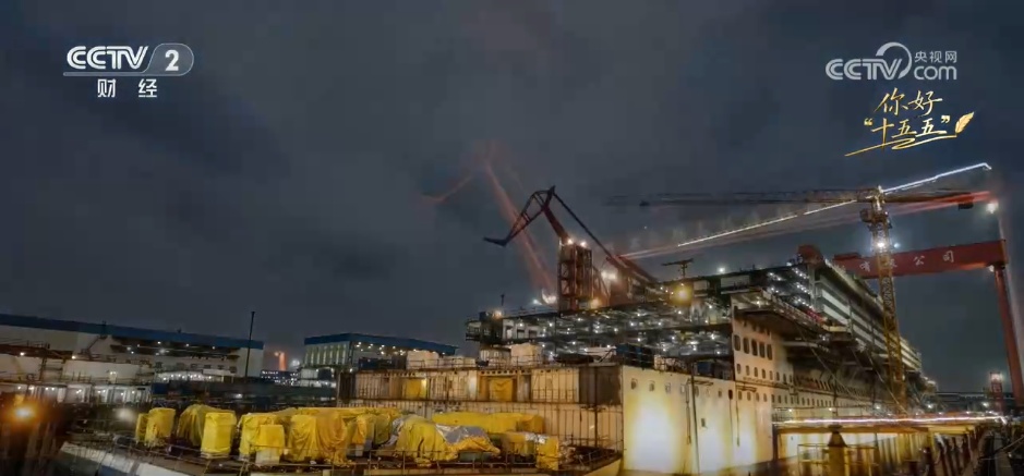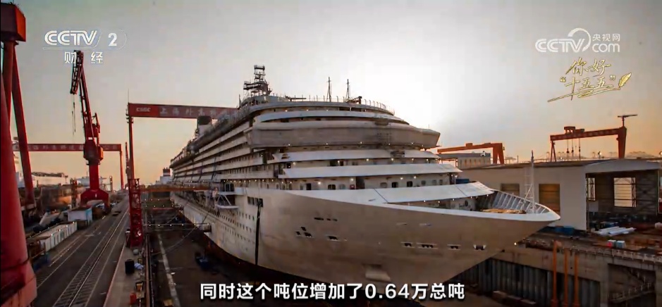 1500公里外,上海外高橋造船廠的2號船塢里,我國第二艘國產大型郵輪“愛達·花城”號正在進行緊張的內裝和調試工作,建設進度已近85%。“相比首制船,整個船體長度加長17米,同時總噸位增加0.64萬總噸 公共區域以及室外區域的整體面積上進行了一定增加,這樣的話給乘客的體驗度會進一步提高。”中船外高橋造船有限公司副總經理陳劍威說。