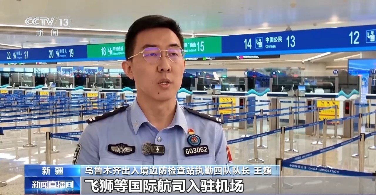 新疆烏魯木齊出入境邊防檢查站執勤四隊隊長 王巍:在免簽效應的帶動下,今年又有斯卡特、飛獅等國際航司入駐機場,并加密了烏魯木齊往返哈薩克斯坦的航班,目前每周往返航班保持在50架次左右,同比增長43%。