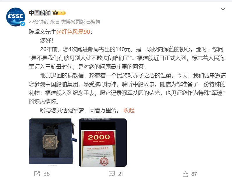 11月10日,@中國船舶發文,邀請26年前捐140元造航母的“小朋友”參觀中國船舶集團,還隨信附贈福建艦入列紀念手表。