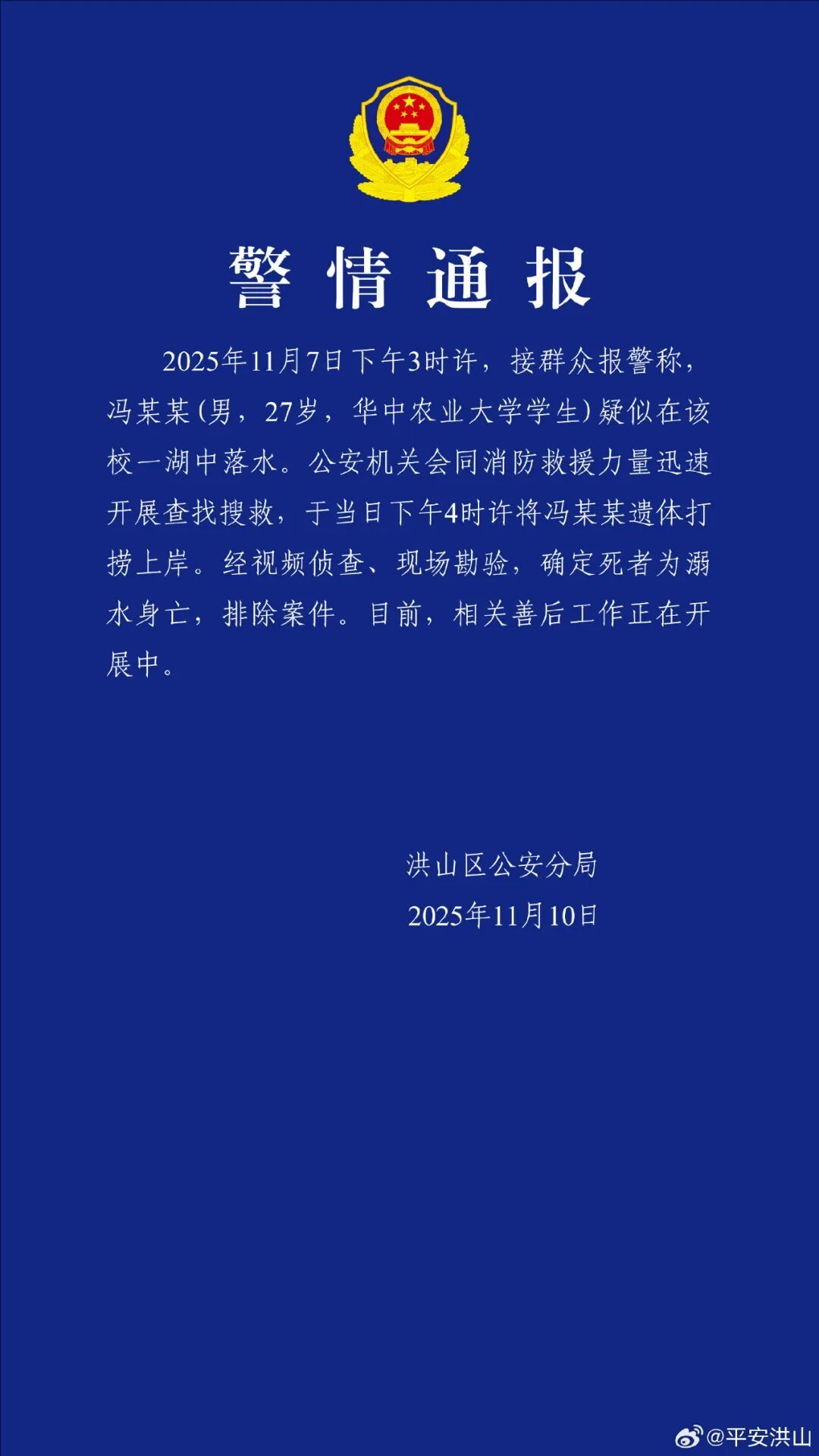2025年11月7日下午3時許,接群眾報警稱,馮某某(男,27歲,華中農業大學學生)疑似在該校一湖中落水。