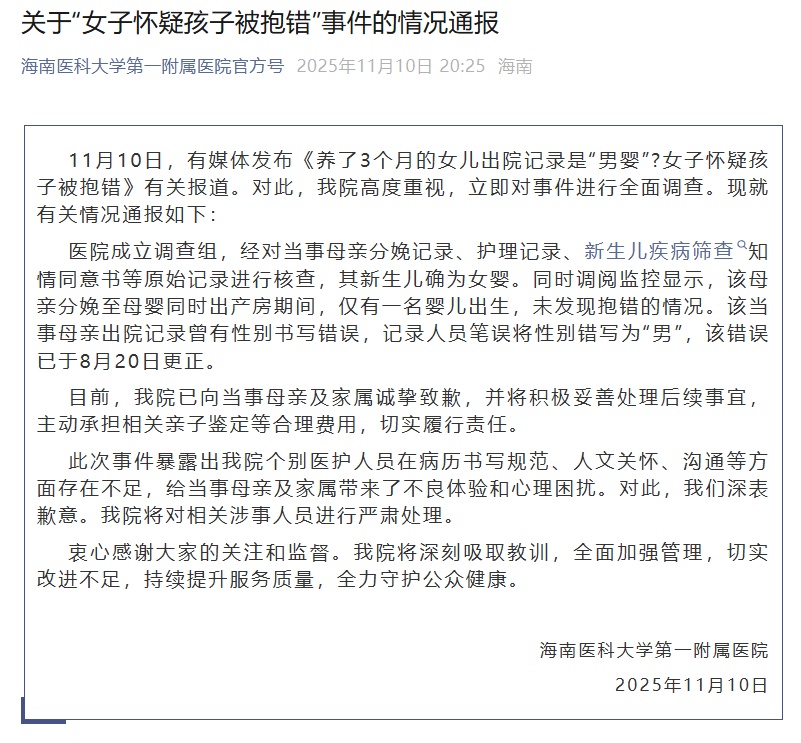 11月10日,有媒體發布《養了3個月的女兒出院記錄是“男嬰”?女子懷疑孩子被抱錯》有關報道。對此,我院高度重視,立即對事件進行全面調查。現就有關情況通報如下: