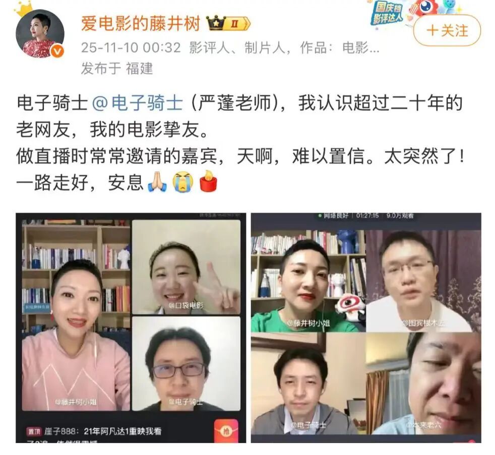 11月10日凌晨,多位影視編劇導演發文悼念知名影評人嚴蓬。有消息稱,嚴蓬(網名“電子騎士”)于昨晚去世。