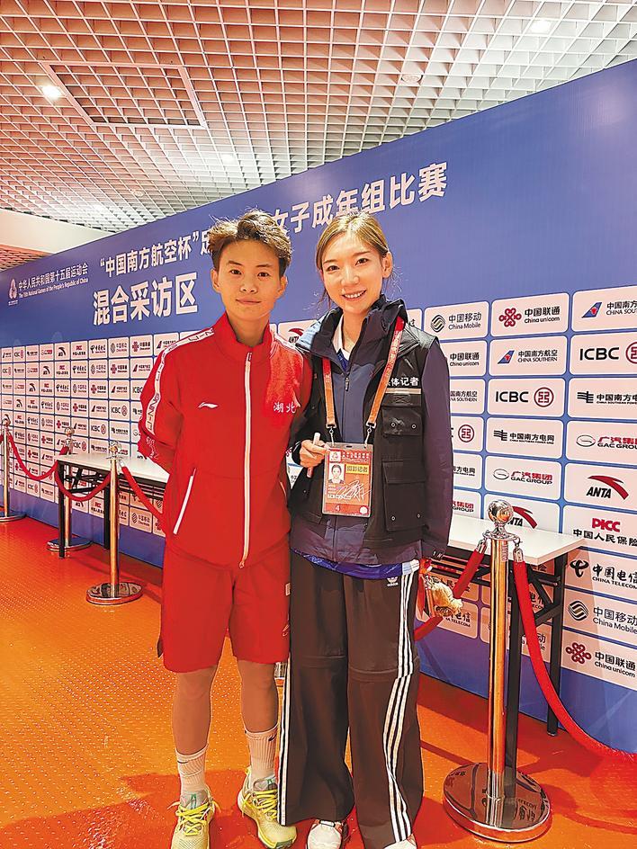 王霜(左)接受湖北日報全媒記者采訪。 (湖北日報通訊員 李杰 攝)