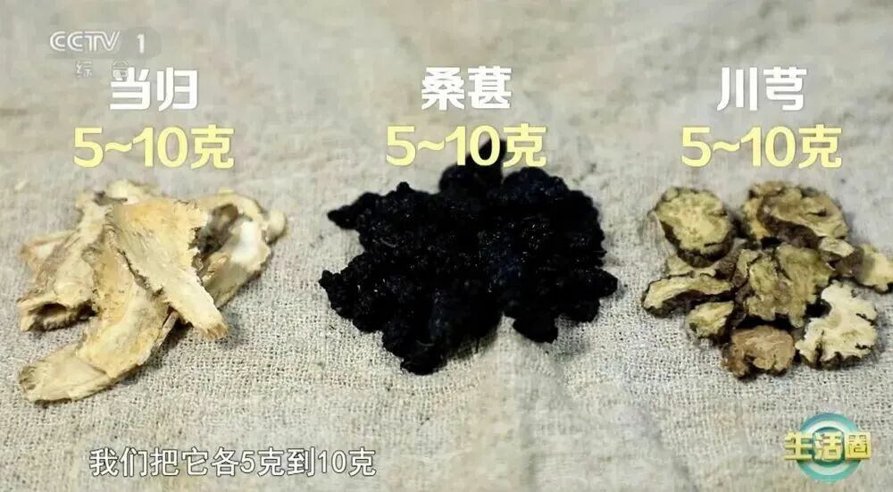 取當(dāng)歸、川芎、桑葚各5~10克,一起煮10~15分鐘后飲用。