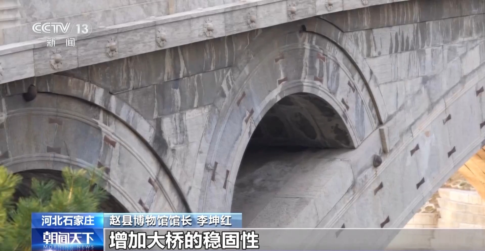 趙縣博物館館長(zhǎng) 李坤紅:肩上的兩個(gè)大小拱不單可以節(jié)省石料,簡(jiǎn)化橋基,增加大橋的穩(wěn)定性,即使“水漫金山”,橋下洪水穿流而過(guò),而趙州橋可以千年不倒。