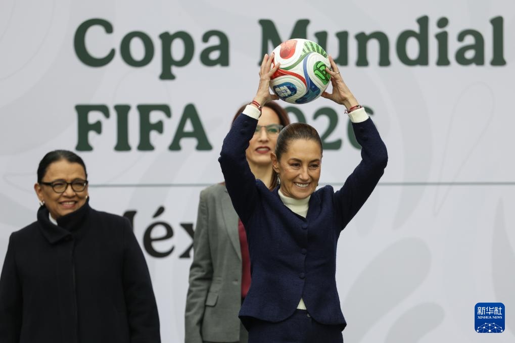 11月10日,墨西哥總統辛鮑姆在發布會上舉起2026年國際足聯世界杯比賽用球。