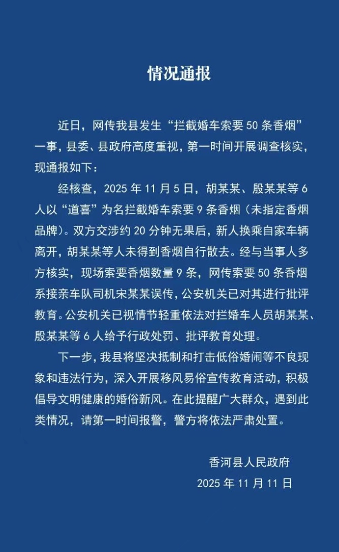 經核查,2025年11月5日,胡某某、殷某某等6人以“道喜”為名攔截婚車索要9條香煙(未指定香煙品牌)。雙方交涉約20分鐘無果后,新人換乘自家車輛離開,胡某某等人未得到香煙自行散去。經與當事人多方核實,現場索要香煙數量9條,網傳索要50條香煙系接親車隊司機宋某某誤傳,公安機關已對其進行批評教育。公安機關已視情節輕重依法對攔婚車人員胡某某、殷某某等6人給予行政處罰、批評教育處理。
