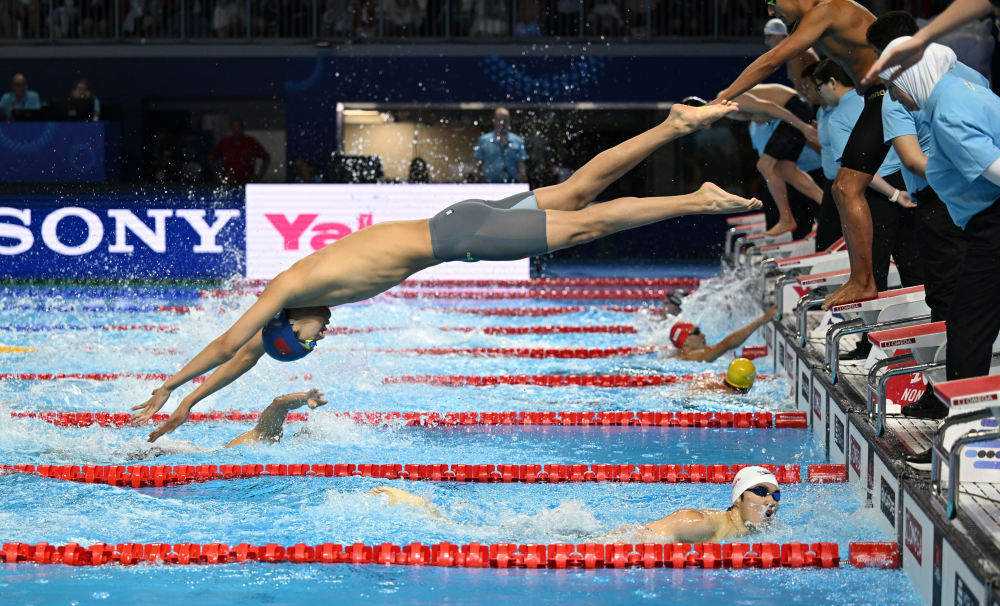 2025年8月1日,中國隊選手汪順(下)與張展碩(上)在比賽中交接。新華社記者 夏一方 攝