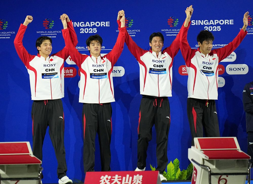 2025年8月1日,亞軍由潘展樂、汪順、張展碩、季新杰(從左至右)組成的中國隊在比賽后。新華社記者 夏一方 攝
