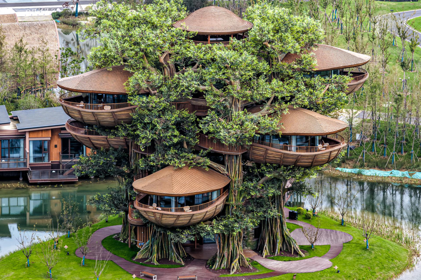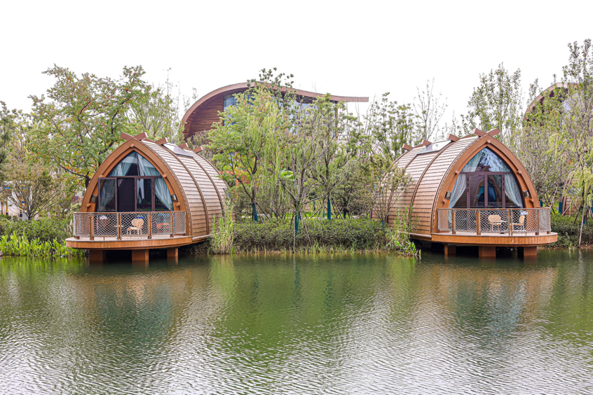 步入園區,錯落有致的樹屋隱匿在茂密樹林間,木質棧道蜿蜒穿梭,仿佛瞬間闖入童話森林。網絡大V張巖忍不住感慨:“這是現實版童話樹屋,仿佛穿越進了魔法世界?!焙系拇莞唔嵨?,原木結構搭配全景舷窗,推窗即見波光粼粼的湖面,木質甲板延伸至水邊,可憑欄觀湖、投喂游魚,與樹屋的林間靜謐形成獨特呼應,成為大V們爭相打卡的“網紅住宿”。