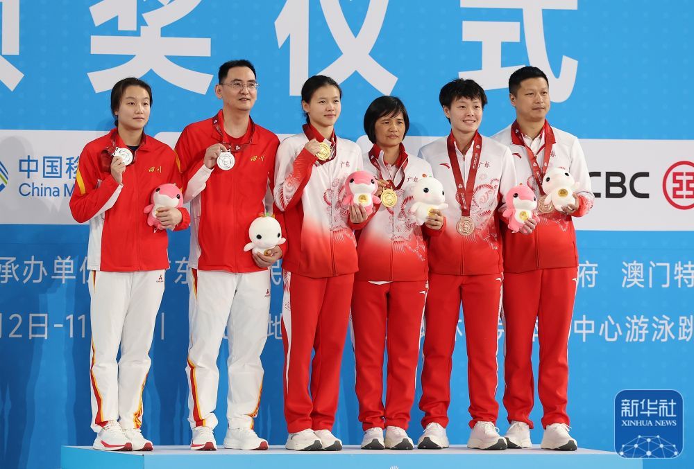 ↑ 獲得冠軍的廣東隊(duì)選手林珊(左三)、獲得亞軍的四川隊(duì)選手陳佳(左一)、獲得季軍的廣東隊(duì)選手陳藝文(右二)和她們的教練員在頒獎(jiǎng)儀式上合影。 新華社記者 楊世堯 攝